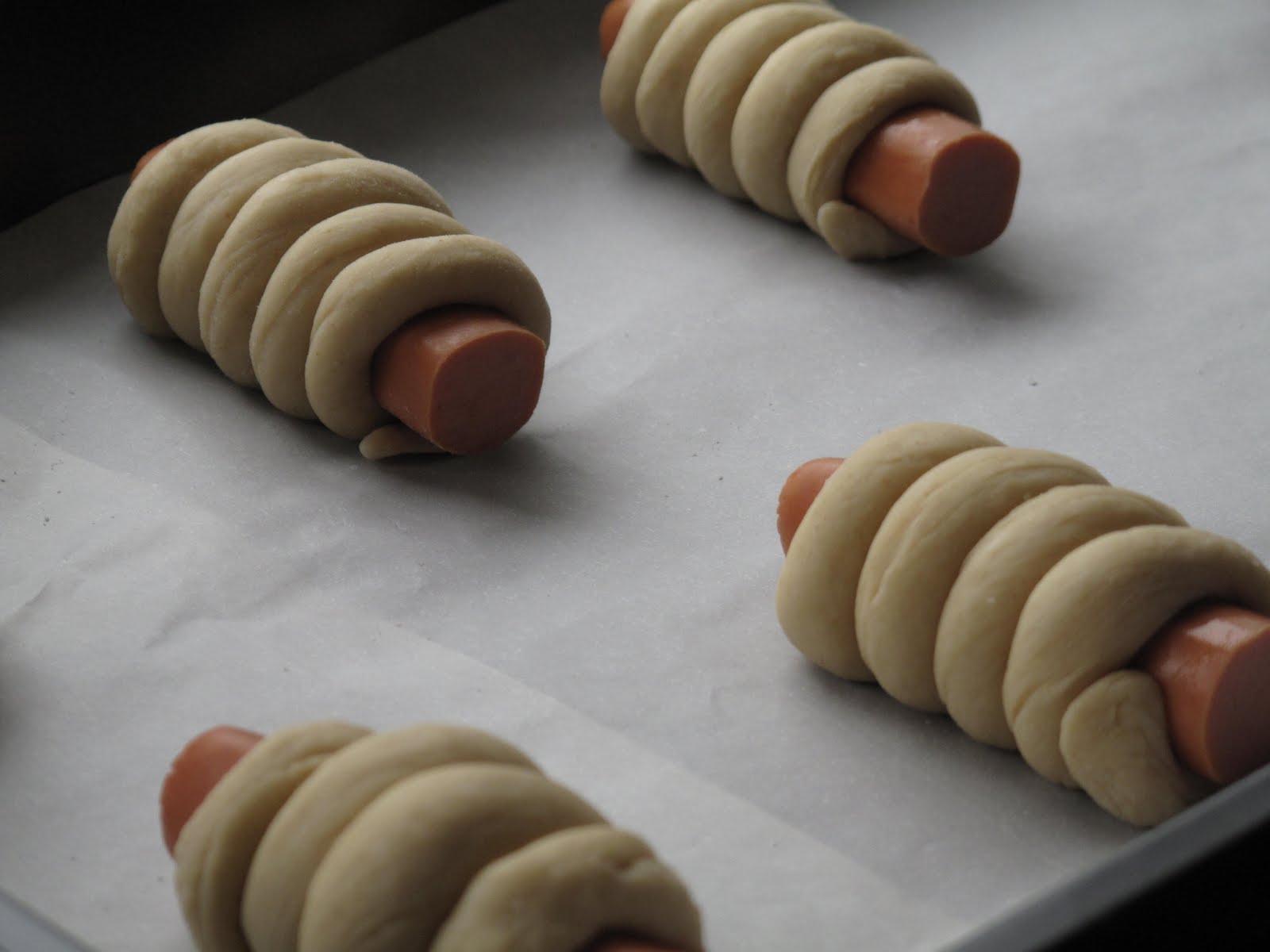 7. Prepare parchment paper. Roll into long worms, stretch it a bit and wrap around frankfurter. Try to leave both ends at the bottom.